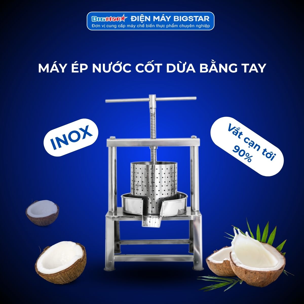 Máy ép nước cốt dừa bằng tay bán tự động loại 2kg được sản xuất bởi Công ty BigStar thích hợp để dùng cho nhu cầu ép cơm dừa xay nhuyễn lấy nước cốt dừa dùng trong chế biến món ăn, làm bánh, tinh dầu làm đẹp, vv.