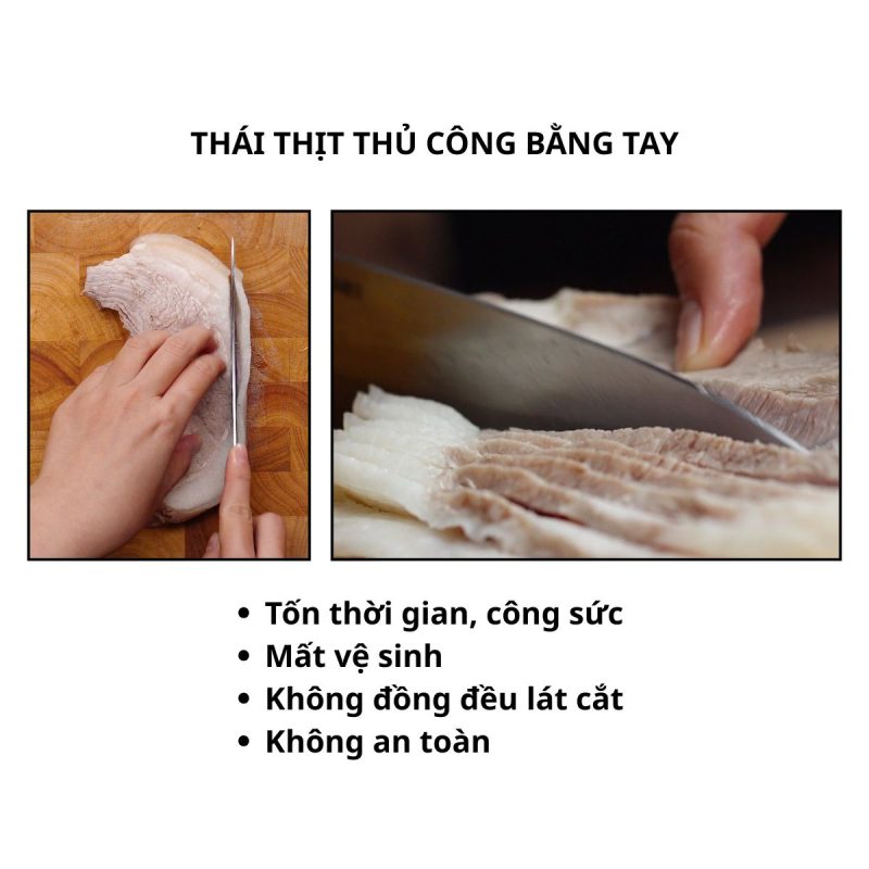 Tại các quán ăn, nhà hàng, cơ sở chế biến thực phẩm, nhu cầu thái thịt heo mỗi ngày thường rất lớn, nếu thực hiện bằng phương pháp thủ công, đầu bếp sẽ mất rất nhiều thời gian để cắt thịt, chưa kể các lát thịt còn dày mỏng không đều.