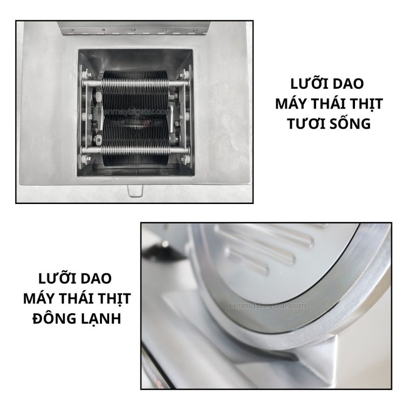 Ngoài sự khác nhau về cấu tạo lưỡi dao, hai dòng máy này còn khác nhau về loại nguyên liệu phù hợp. Máy thái thịt tươi sống được thiết kế để xử lý các miếng thịt mềm chưa đông đá, giúp cắt nhanh mà không làm nát thịt. Ngược lại, máy thái thịt đông lạnh lại hoạt động hiệu quả nhất khi thịt đã được cấp đông hoặc thịt chín, bởi lúc này khối thịt có độ cứng nhất định, giúp lát cắt mỏng, đẹp và không bị vụn.