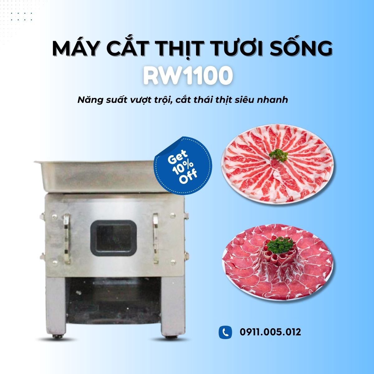 Máy cắt thịt tươi sống RW1100 là dòng máy chế biến thịt được nhiều cơ sở kinh doanh lựa chọn nhờ năng suất ấn tượng lên đến 150kg/giờ. Thiết bị không chỉ đảm bảo vệ sinh an toàn thực phẩm mà còn giúp tiết kiệm chi phí khi có thể thay đổi độ dày lát thịt linh hoạt bằng cách thay bộ dao ngay trên cùng một máy.