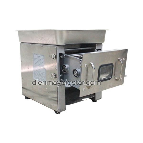 + Cửa đưa thịt vào máy khá rộng, cho phép cắt được các khổ thịt lớn mà không cần chia nhỏ nhiều lần. Phần nắp bảo vệ phía trên giúp hạn chế rủi ro khi vận hành. Bên trong, motor lõi đồng nguyên chất hoạt động mạnh và bền, vận hành êm, không gây tiếng ồn lớn.